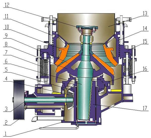 PSG圓錐破碎機(jī)工作時(shí),由電動(dòng)機(jī)通過(guò)三角帶、大帶輪、傳動(dòng)軸、小錐齒輪、大錐齒輪帶動(dòng)偏心套旋轉(zhuǎn),破碎圓錐軸心線在偏心軸套的迫動(dòng)下做旋轉(zhuǎn)擺動(dòng),使得破碎壁表面時(shí)而靠近又時(shí)而離開軋臼壁的表面,從而使物料在定錐與動(dòng)錐組成的環(huán)形破碎腔內(nèi)不斷地受到?jīng)_擊、擠壓和彎曲而破碎。經(jīng)過(guò)多次擠壓、沖擊和彎曲后,物料破碎至要求粒度,經(jīng)下部排出。
